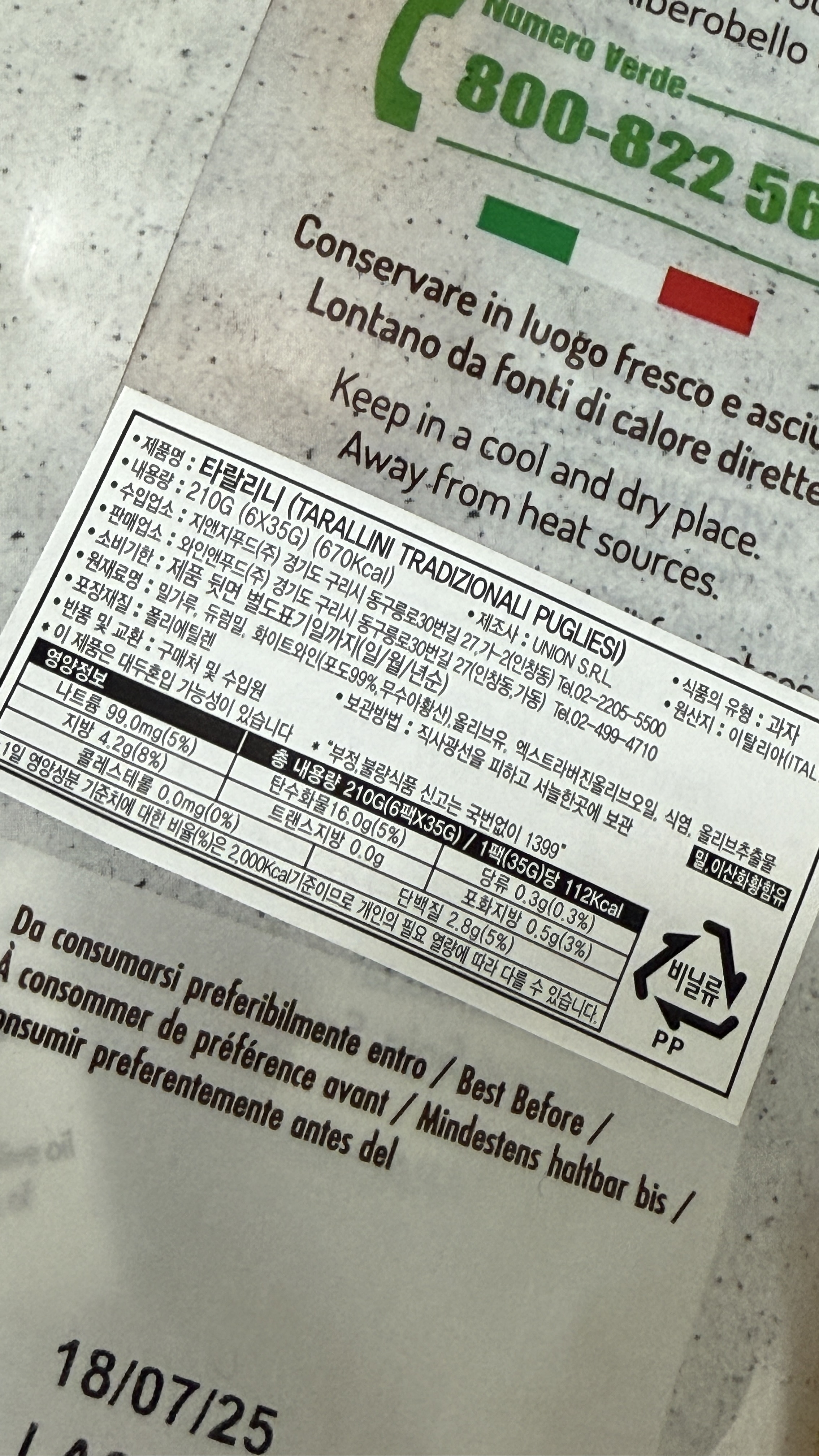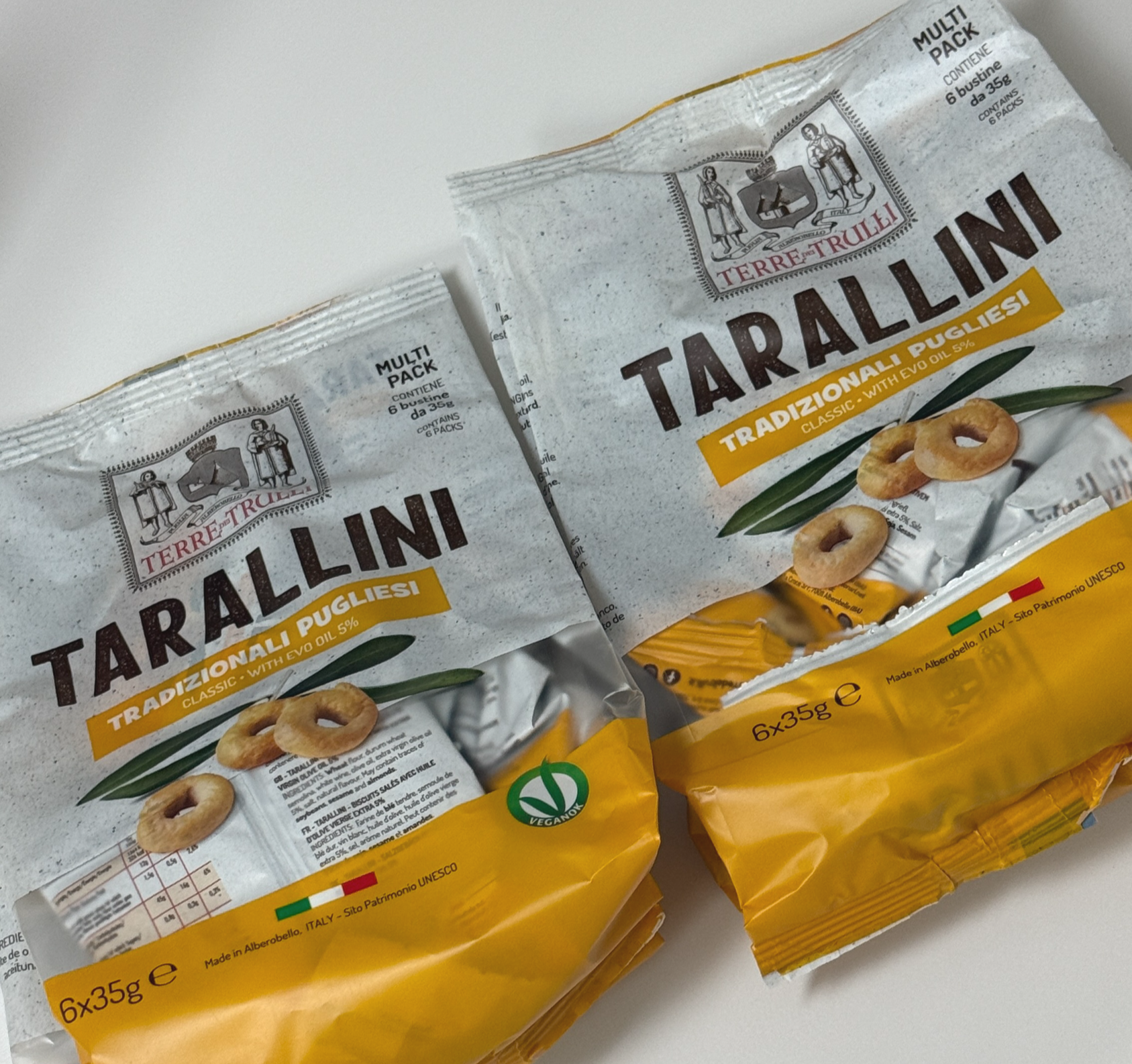 현재 한국에 수입되어 판매되고 있는 타랄리니는 원산지 이탈리아로 밀가루, 듀럼밀, 화이트와인, 올리브유, 엑스트라버진 올리브유, 식염, 올리브추출물로 만들어진 과자입니다. 먹어보니 정말 깔끔하고 베이글을 구운 스낵 같았어요.
