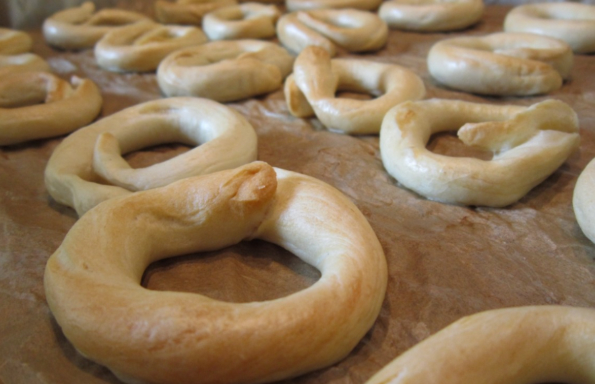 조리 과정: 반죽을 만든 후, 작은 조각으로 잘라서 끈 모양으로 만든 다음 고리로 연결합니다. 이후 끓는 물에 살짝 데친 후 오븐에서 구워 바삭하게 만듭니다.